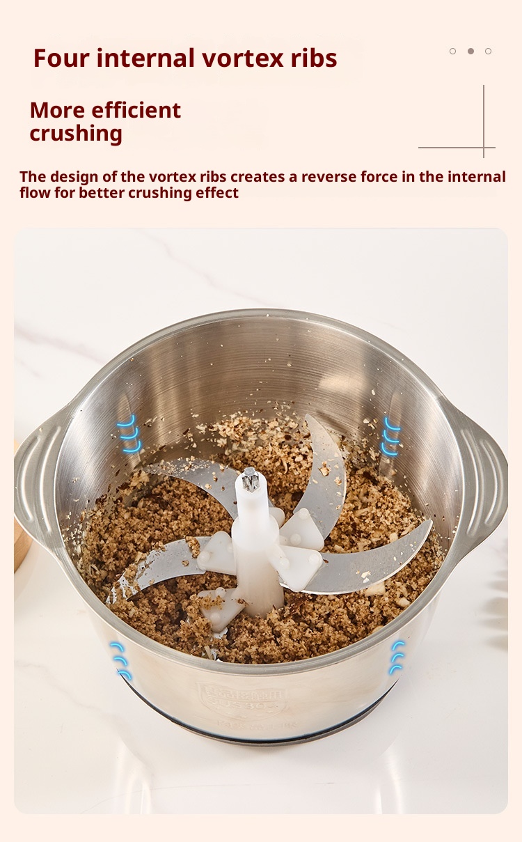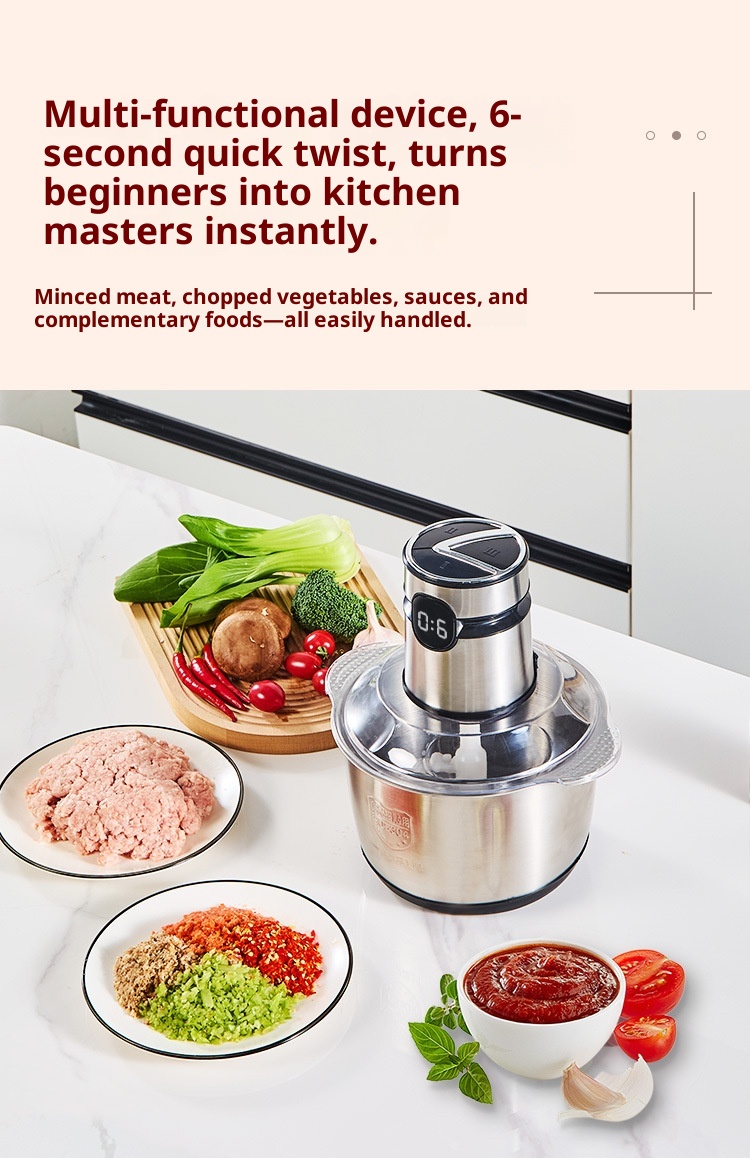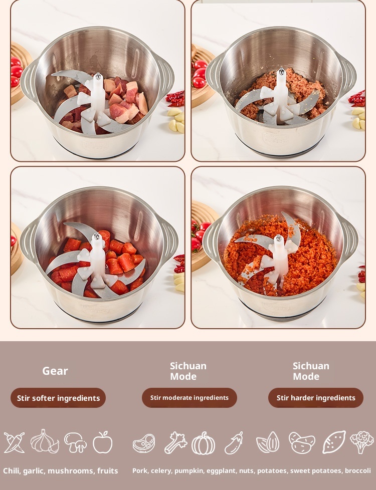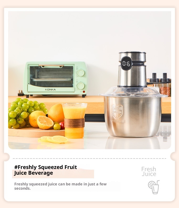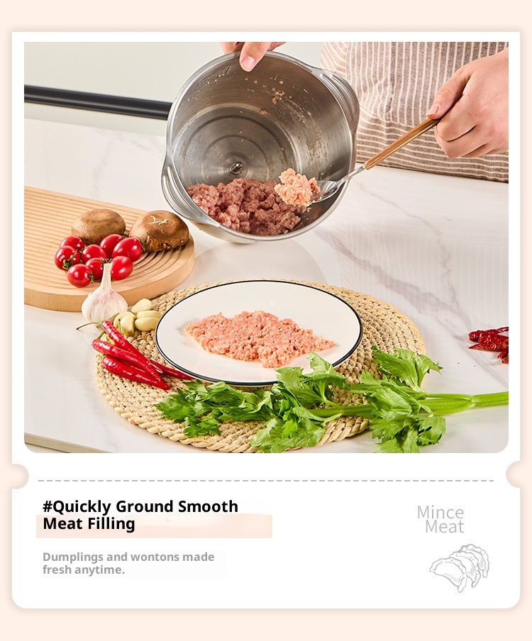 Function: baby food supplement, adjustable speed, chopping and slicing, meat sausage, egg mixture, quick peeling garlic, multi-bowl easy to store
